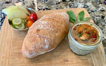 This simple chunky wild mushroom paté is filled with umami-richness enhanced with garlic, fresh herbs, brandy, and lemon zest and finished with a rich cap of Bolette butter. Served with warm baguette and accompaniments.